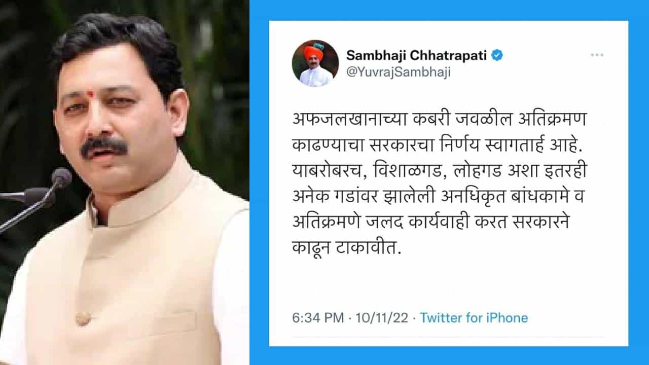 शिंदे-फडणवीस सरकारने छत्रपती शिवाजी महाराज यांच्या गडावरील अनाधिकृत बांधकाम हटवण्याचा निर्णय घेतल्यानंतर माजी खासदार संभाजीराजे यांनी ट्विट करत म्हणाले की, अफजलखानाच्या कबरी जवळील अतिक्रमण काढण्याचा सरकारचा निर्णय स्वागतार्ह आहे.