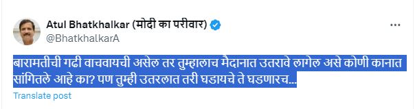 ”बारामतीची गढी वाचवायची असेल तर तुम्हालाच मैदानात उतरावे लागेल असे कोणी कानात सांगितले आहे का? पण तुम्ही उतरलात तरी घडायचे ते घडणारच…,” असा टोला अतुल भातखळकर यांनी लगावला आहे. अतुल भातखळकर यांचे हे ट्विट चांगलेच चर्चेत आले आहे. बारामतीमध्ये सुप्रिया सुळे यांच्या विरोधात अजित पवार यांच्या पत्नी सुनेत्रा पवार निवडणूक मैदानात उतरणार असल्याचे जवळपास निश्चित झाले आहे. या संदर्भातील अधिकृत घोषणा महायुतीच्या जागा वाटप दरम्यान होणार आहे. राष्ट्रवादीच्या दोन्ही गटाकडून प्रचार जोरात सुरु आहे.