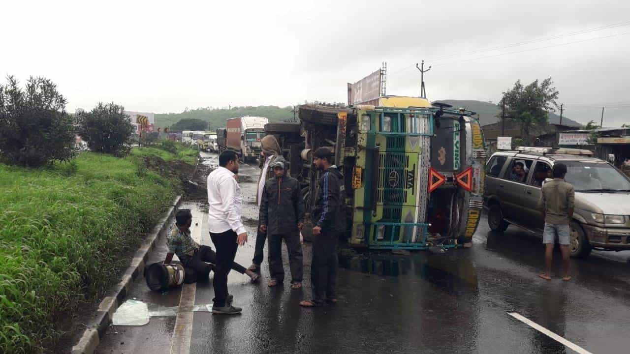पाऊस आणि तीव्र उतार यामुळे चालकाचे कंटेनरवरचे नियंत्रण सुटले
