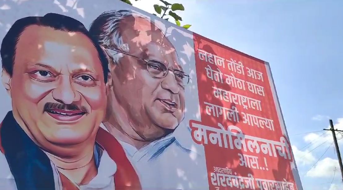 राष्ट्रवादी काँग्रेसचे नेते शरद पवार आणि अजित पवार मांजरी येथील वसंतदादा शुगर इन्स्टिट्युटच्या (व्हीएसआय) बैठकीनिमित्त शुक्रवारी एकत्र येणार होते. या ठिकाणीच दोन्ही नेत्यांना आवाहन करणारे बॅनर लावले गेले आहे. राष्ट्रवादी काँग्रेसचे अध्यक्ष शरद पवार आणि राष्ट्रवादी काँग्रेसचे नेते, उपमुख्यमंत्री अजित पवार यांच्या मनोमिलनासंदर्भातील हे बॅनर आहे. पुण्यातील वसंतदादा शुगर इन्स्टिट्यूटच्या बाहेर हा फ्लेक्स लावला आहे. त्यावर लिहिले आहे की, “लहान तोंडी आज घेतो मोठा घास महाराष्ट्राला लागली आपल्या मनोमिलनाची आस”