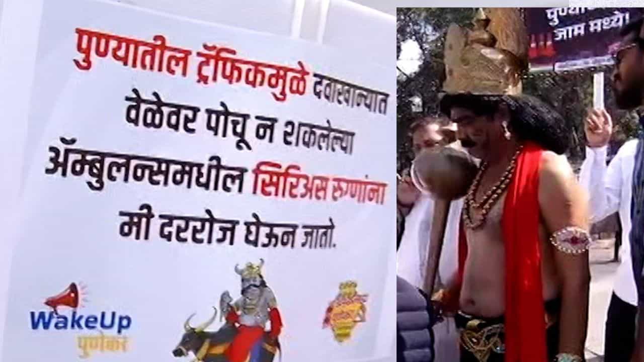 पुण्यातील स्वारगेट चौकात वेक अप पुणेकर आणि काँग्रेस नेते मोहन जोशी यांनी वाहतूक कोंडीवर लक्ष वेधण्यासाठी अनोखे आंदोलन केले. काँग्रेसने आंदोलनात यमदूत आणला. वाहतूक कोंडीमुळे एम्बुलेंस वेळेत न पोहोचल्याने रुग्णांचा जीव जात आहे. त्यामुळे यमदूत वाहतूक कोंडी सोडवण्याचे आवाहन करत आहे. तसेच यावेळी फलकही लावण्यात आले आहे. त्यात म्हटले आहे की, पुण्यातील ट्रॅफिकमुळे दवाखान्यात वेळेवर न पोहचू शकणाऱ्या रुग्णवाहिकेतील सिरियस रुग्णांना मी रोज घेऊन जातो.