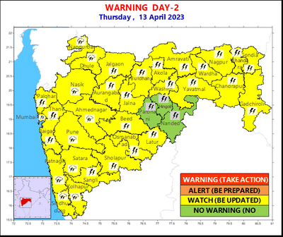 Warnings are issued by IMD for next 5 days in Maharashtra. Thunderstorm with accompanied with lightning, gusty winds & hail at isolated places in parts of Madhya Mah on day 2 & 3.@RMC_Mumbai @imdnagpur pic.twitter.com/JKvi75s4Bj— K S Hosalikar (@Hosalikar_KS) April 12, 2023