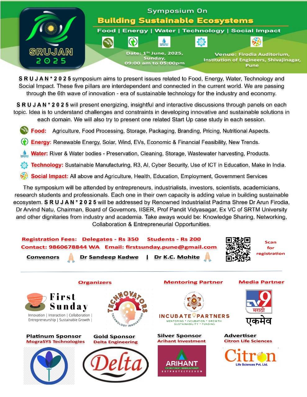 फर्स्ट संडे व टेक्नोव्हेटर्स यांच्या संयुक्त विद्यमाने सामाजिक उपक्रमांतर्गत “सृजन – २०२५” – “बिल्डिंग सस्टेनेबल इकोसिस्टम” या परिसंवादाचे पुण्यात १ जून रोजी सकाळी नऊ ते सायंकाळी पाच या वेळेत आयोजन करण्यात आले आहे. इन्क्युबेट पार्टनर्स या परिसंवादाचे मेंटॉर आहेत. फूड, एनर्जी, वॉटर, टेक्नॉलॉजी व सोशल इम्पॅक्ट क्षेत्रातील आव्हाने, संधी व उपाय याबाबत या परिसंवादात पाच पॅनेल्स मध्ये दिवसभर चर्चा होणार आहे. ठिकाण फिरोदिया सभागृह, इन्स्टिटयूट ऑफ इंजिनिअर बिल्डिंग, शिवाजीनगर आहे. परिसंवादात सामील होण्याची फीस फक्त तीनशे पन्नास रुपये इतकी कमी ठेवण्यात आली आहे.