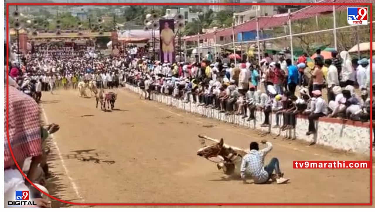 Pune Bullock cart race : घोडीचा पाय घसरला अन्… पुण्याच्या लोणीकंदमधल्या बैलगाडा शर्यतीत थोडक्यात बचावला तरूण, पाहा Video