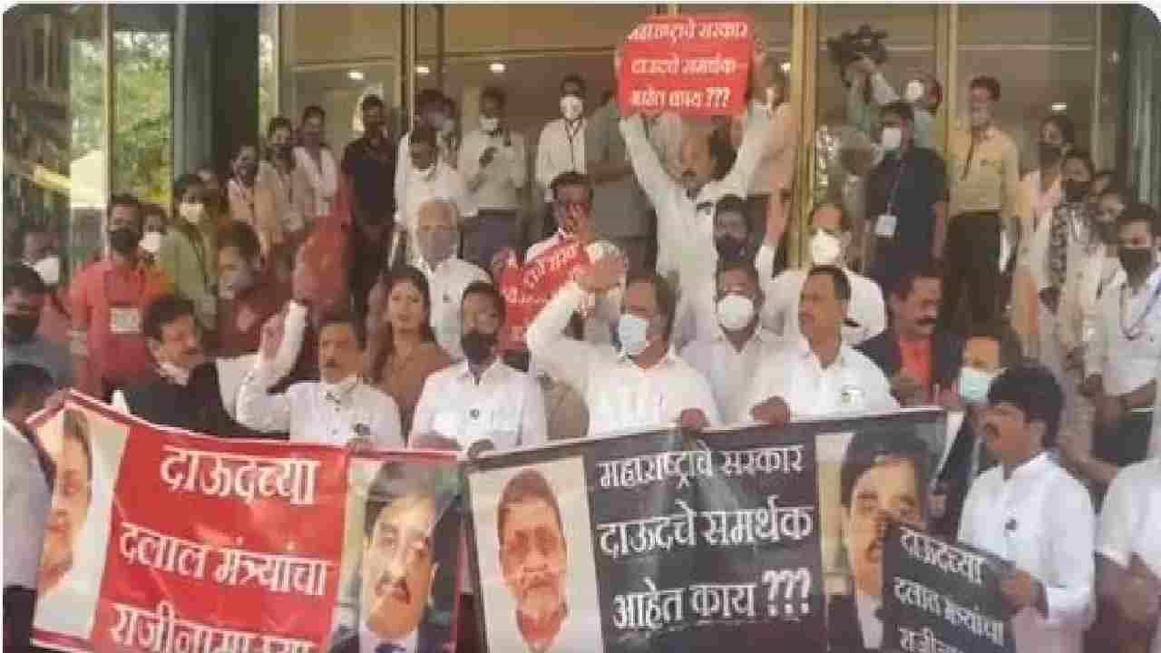 दाऊदच्या दलाल मंत्र्यांचा राजीनामा घ्या, अशा घोषणा विरोधकांनी यावेळी दिल्या. मुंबई बॉम्बस्फोटातील आरोपी दाऊदशी संबंधित व्यक्तींकडून जमीनी विकत घेण्याचा आरोप नवाब मलिक यांच्यावर आहे. त्यामुळे हा सर्वात मोठा देशद्रोह असल्याची टीका भाजप नेते देवेंद्र फडणवीस यांनी काल केली होती. यावरून नवाब मलिक यांचा राजीनामा घेतलाच पाहिजे, अशी मागणी त्यांनी केली आहे.