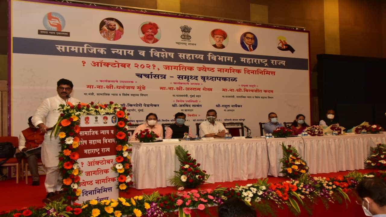 यशवंतराव चव्हाण प्रतिष्ठान सभागृह येथे सामाजिक न्याय व विशेष सहाय्य विभागातर्फे ‘जागतिक ज्येष्ठ नागरिक’ दिनानिमित्त आयोजित समृद्ध वृद्धापकाळ या चर्चा सत्राच्या उदघाटन प्रसंगी सामाजिक न्याय व विशेष सहाय्य मंत्री धनंजय मुंडे बोलत होते. आमदार बाळासोहब आजबे, सामाजिक न्याय विभागाचे अपर मुख्य सचिव अरविंद कुमार, समाज कल्याण आयुक्त पुणे डॉ. प्रशांत नारनवरे, हेल्पेज इंडियाचे संचालक प्रकाश बोरगावंकर, मुंबईच्या माजी महापौर सौ. निर्मला सावंत प्रभावळकर, सामाजिक न्याय विभागाचे सहसचिव दिनेश डिंगळे, फेस्कॉमचे उपाध्यक्ष अण्णासाहेब टेकाळे यांची या कार्यक्रमाला प्रमुख उपस्थिती होती.