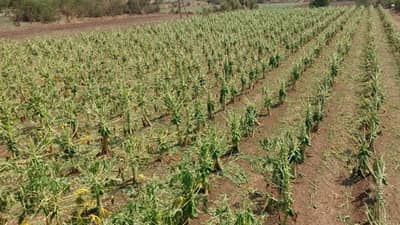 सोलापूर जिल्ह्यातील कलिंगड, टरबूज उत्पादकांना अवकाळी पावसाने घाईला आणले आहे. त्याच प्रमाणे पपई पिकांचेही प्रचंड नुकसान झाल आहे. काढणीसाठी आलेल्या पपईची झाडांना वादळी वाऱ्याचा मोठा फटका बसला आहे.