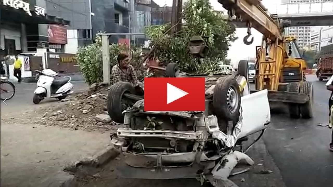 VIDEO | झाडावर धडकून कार उलटली, ठाण्यात विहंग्स इन हॉटेलसमोर भीषण अपघात