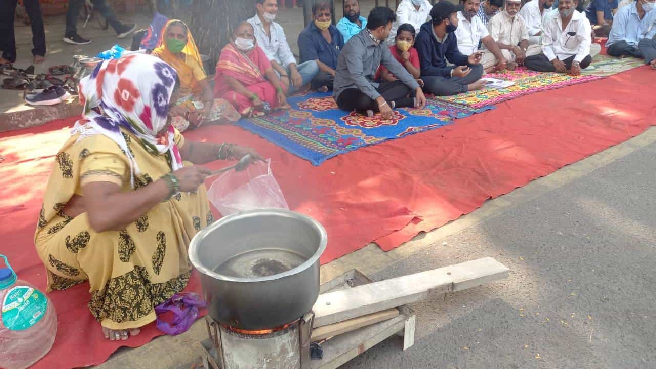 आश्वासन देऊनही ठाणे महापालिकेने कारवाई करण्यात येत आहे. ही कारवाई थांबविण्यात यावी, या मागणीसाठी अनेकवेळा पत्रव्यवहार करण्यात आला होता. मात्र त्याकडे दुर्लक्ष करण्यात आले. या संदर्भात अतिरिक्त आयुक्त संजय हेरवाडे यांच्यासोबत सोमवारी चर्चादेखील करण्यात आली. मात्र, चर्चेत तोडगा न निघाल्याने चर्मकार समाज अंथरून, पांघरूणासह ठामपासमोर ठाण मांडून बसले. या ठिकाणी आंदोलकांनी चूल पेटवून अन्न शिजवले. या आंदोलनात चर्मकार बांधव मोठ्या संख्येने सहभागी झाले होते.