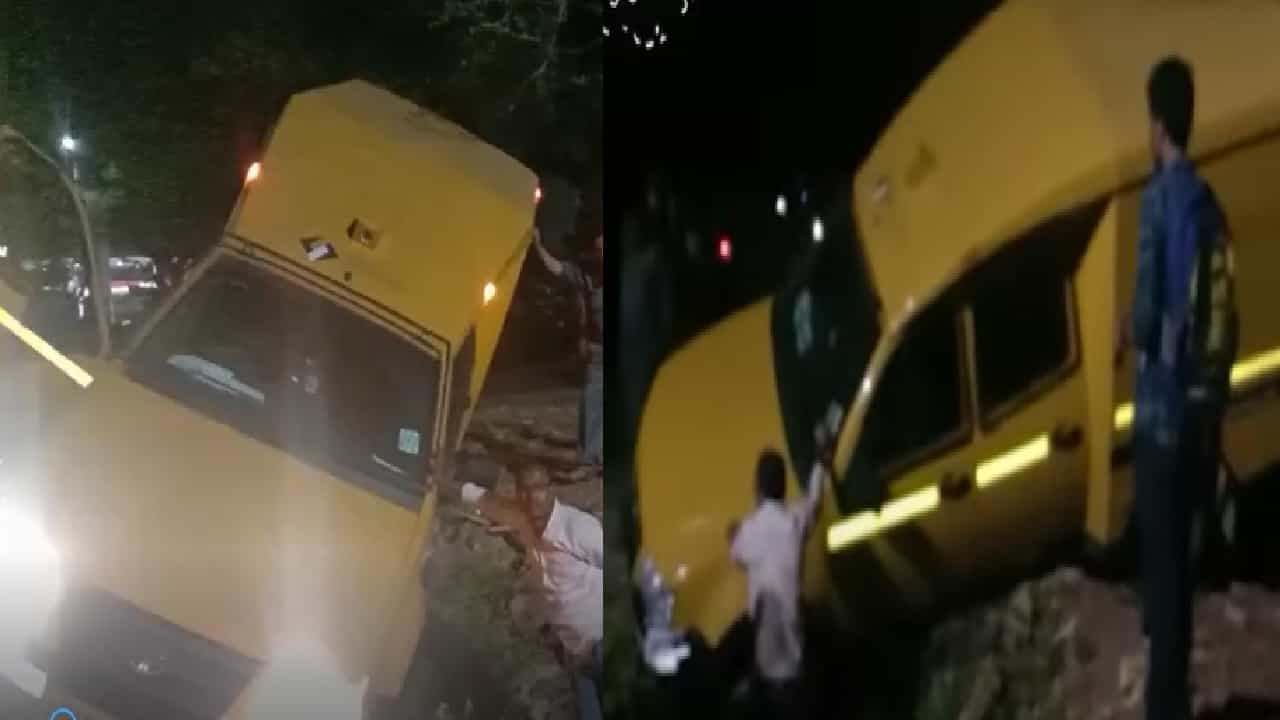 VIDEO | बँकेची कॅश व्हॅन मुरबाडमधील गटारात अडकली, पलटी होणार तोच…
