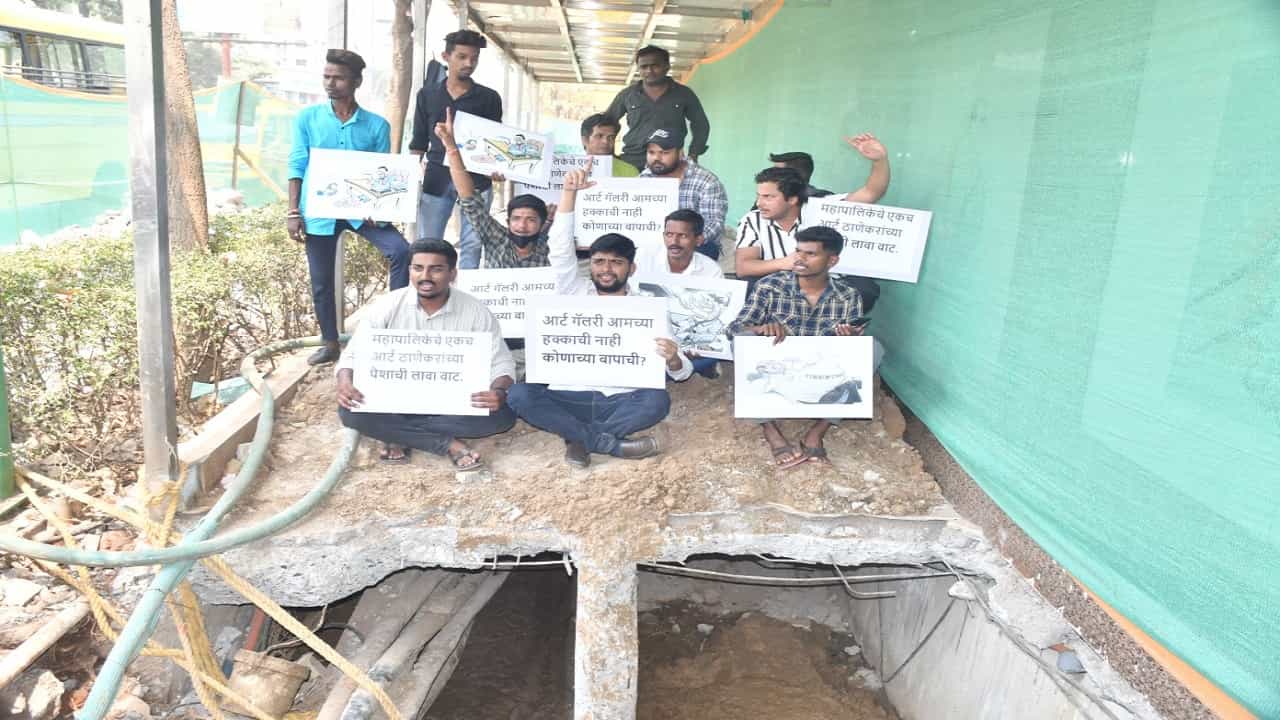 ठाणे : ठाणे शहरातील कलेला वाव देत चार वर्षांपूर्वी ठाणे महापालिका आयुक्त संजीव जयस्वाल यांनी काला घोडा येथे असलेल्या आर्ट प्लाझाच्या धर्तीवर आर्ट गॅलरी (Art Gallery) बनविण्यात आली. एक कोटी खर्च करून चार वर्षही लोटले नाही तर या आर्ट गॅलरीची नासधूस महापालिकेच्या बांधकाम विभागाच्या माध्यमातून सुरू झाली आहे. या गॅलरीच्या मधोमध मोठे खड्डे केले असून याच परिसरात फुट ओव्हर ब्रीजच्या पिलरचे कामही करण्यात येत आहे. त्यामुळे ही आर्ट गॅलरी नामशेष होण्याची शक्यता आहे. ही आर्ट गॅलरी वाचविण्यासाठी आज महाराष्ट्र नवनिर्माण सेनेचे स्वप्नील महिंद्रकर यांच्या वतीने आर्ट गॅलरीच्या बचावासाठी ठिया आंदोलन (Protest) करण्यात आले. (Movement on behalf of MNS for protection of Art Gallery in Thane)