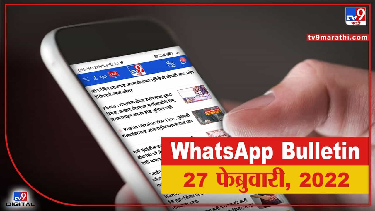 What's App Bulletin : आज 27 फेब्रुवारी, 2022. मराठी राजभाषा दिनी राज्यात वेगवेगळ्या कार्यक्रमाचं आयोजन करण्यात आलं. आजचा दिवस फार महत्त्वपूर्ण घडामोडींचा होता. युक्रेन युद्धासोबत राष्ट्र, राज्य आणि जिल्हा पातळीवरही महत्त्वपूर्ण घडामोडी घडल्या. मनोरंजन आणि क्रीडा क्षेत्रासह महत्त्वाच्या घडामोडींचा आढावा घेऊयात टीव्ही 9 मराठीच्या व्हॉट्सअप बुलेटिनमधून
