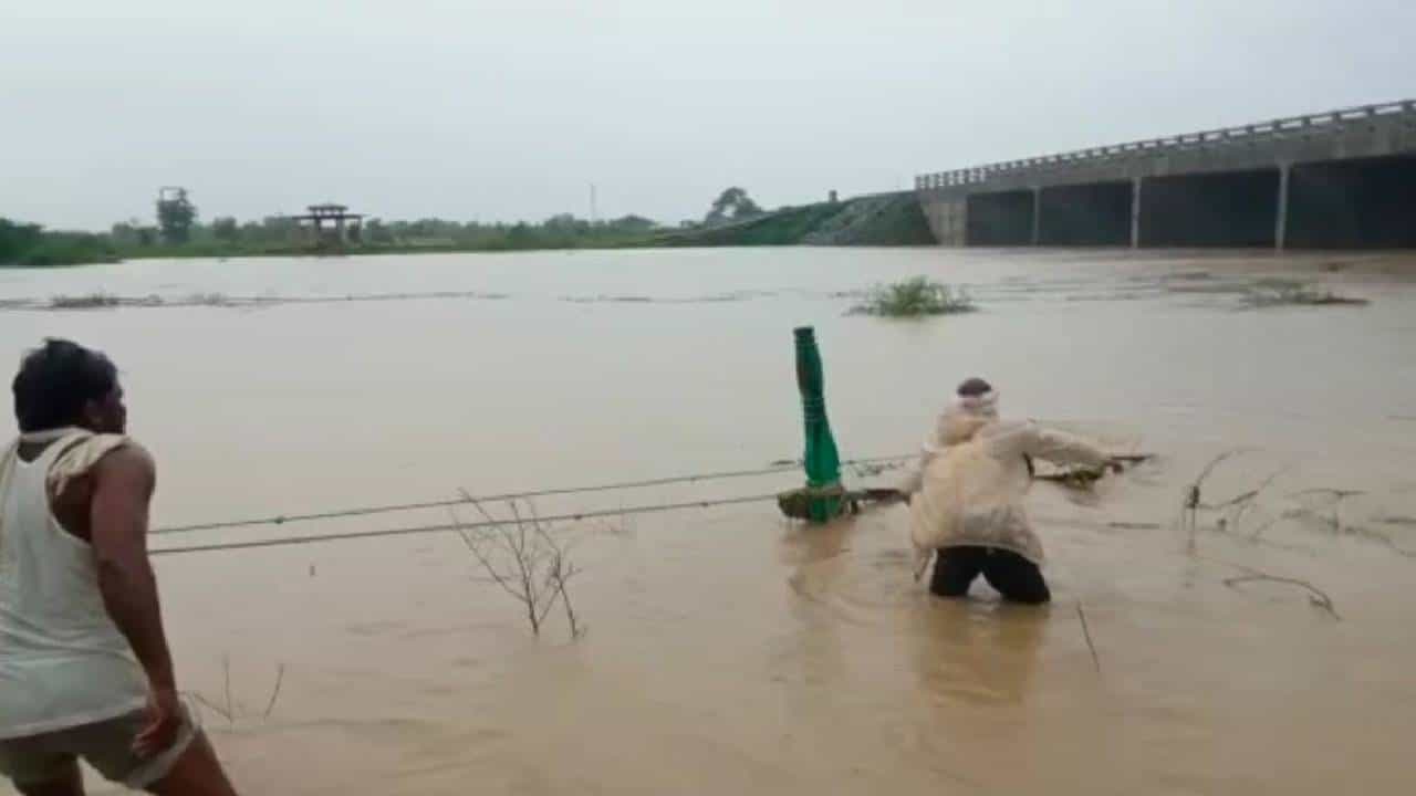 वर्धा : हिंगणघाट तालुक्यात मागील तीन दिवसांपासून दमदार पाऊस सुरु आहे. या पावसामुळे यशोदा नदी (Yashoda River) दुथडी भरून वाहू लागली. नदीला पूर आला आहे. मनसावळी परिसरात पुराच्या पाण्यात बैलगाडीसह बैल वाहून गेल्याची घटना घडली. सुदैवाने ३ शेतकरी थोडक्यात बचावले. सिरसगाव येथील तीन शेतकरी शेतातून बैलगाडी घेऊन नदी पार करीत होते. मात्र, अचानक यशोदा नदीत अचानक पाण्याचा प्रवाह वाढला. बैलगाडीसह बैलगाडीवर असलेले पांडुरंग कुभलकार (Pandurang Kubhalkar), आर्यन येसंबरे, विनायक उरकुडे (Vinayak Urkude) हे तिन्ही शेतकरी पाण्याच्या प्रवाहात वाहून गेले. अशात बैलगाडी नदीत उलटली. पुढील तीन-चार दिवस पावसाचा अंदाज हवामान विभागानं व्यक्त केलाय. वीज कोसळून होणाऱ्या आपत्तीपासून सुरक्षित राहण्यासाठी दामिनी अँप वापरावे, असे आवाहन वर्धा जिल्हा प्रशासनाने केले आहे.