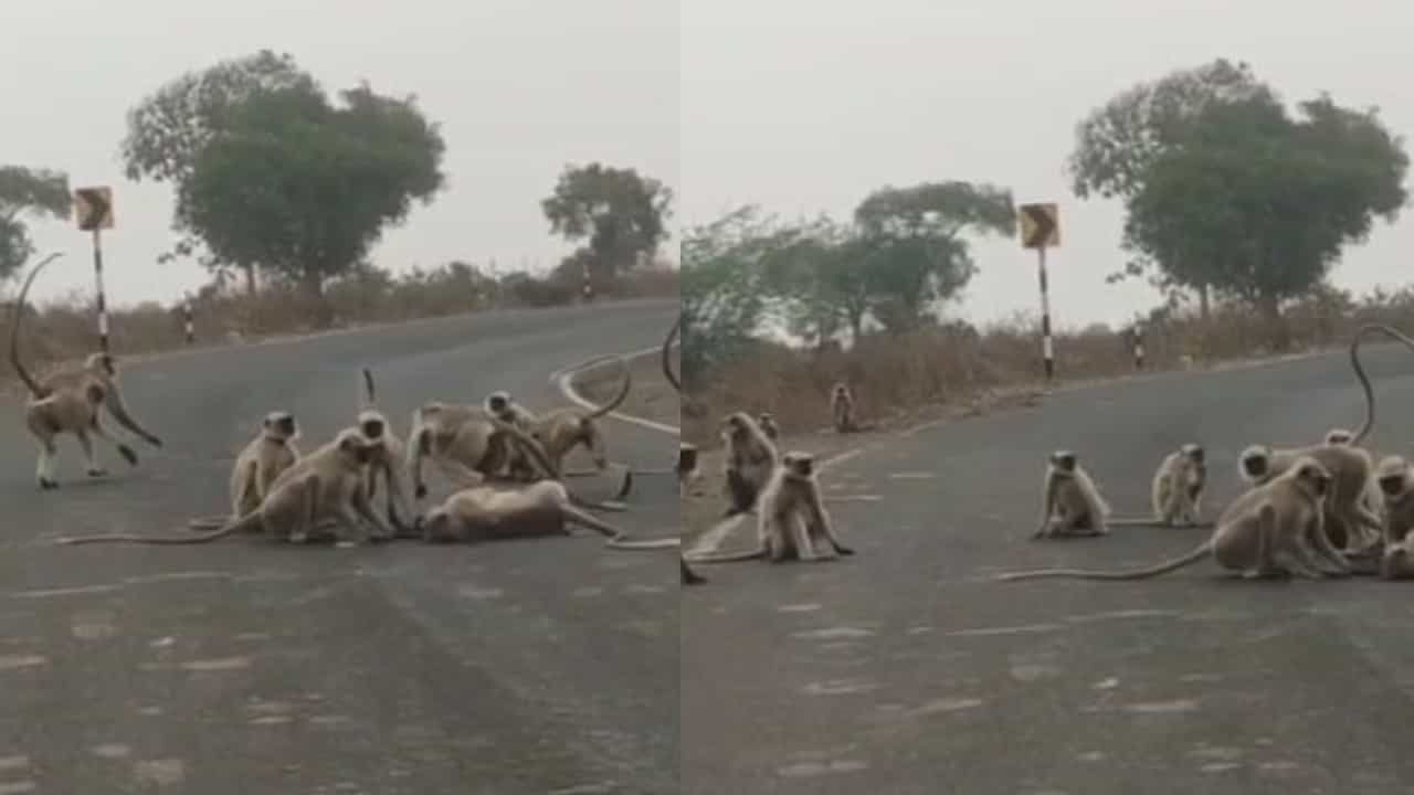 आपल्यासोबतच्या एका साथीदाराचा अपघात झालेले बघताच मदतीसाठी अनेक वानरे रस्त्यावर आली. इतकेच नव्हेतर त्या वानराला वाचवण्यासाठी इतर सर्व वानरे प्रयत्न करत होती. मात्र, अचानकच त्या वानराने आपला जीव सोडला आणि उपस्थित सर्व वानरांनी रस्ता रोखून ठेवला. हा सगळा प्रकार हृदय हदरवणारा होता. त्यांचं दुःख आणि आक्रोश त्या मुक्या वानरांच्या शरीर हालचालीद्वारे स्पष्ट दिसत होते.