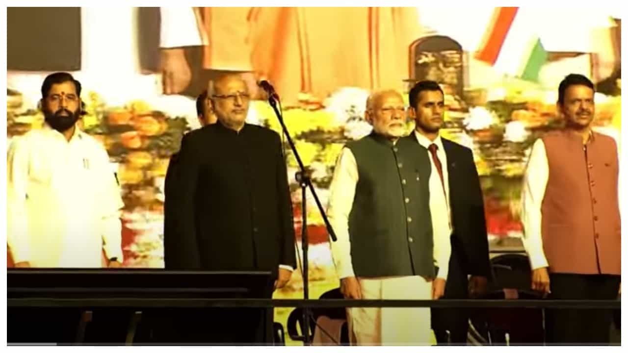 सर्व दिग्गज नेतेमंडळी मंचावर उपस्थित होते. संध्याकाळी साडेपाच वाजेच्या सुमारास नरेंद्र मोदी मंचावर आले. नरेंद्र मोदी यांचं व्यासपीठावर आगमन होत असताना, त्याच क्षणी देवेंद्र फडणवीस, एकनाथ शिंदे आणि अजित पवार हे तीनही नेते एकत्रपणे मंचावर दाखल झाले. त्यांनी मंचावर उपस्थित असलेल्या सर्व दिग्गज नेत्यांसोबत हस्तांदोलन केलं. यानंतर ते आपल्या जागेवर स्थानापन्न झाले. यावेळी देवेंद्र फडणवीस आणि अजित पवार हे आजूबाजूला बसले. पण एकनाथ शिंदे हे दोन खुर्च्या सोडून बाजूला बसले. त्यामुळे एकनाथ शिंदे हे उपमुख्यमंत्रीपदाची शपथ घेणार की नाही? अशी शंका निर्माण झाली. या दरम्यान पंतप्रधान नरेंद्र मोदी, महाराष्ट्राचे राज्यपाल सी. पी. राधाकृष्णन मंचावर दाखल झाले आणि शपथविधीच्या कार्यक्रमाला सुरुवात झाली.