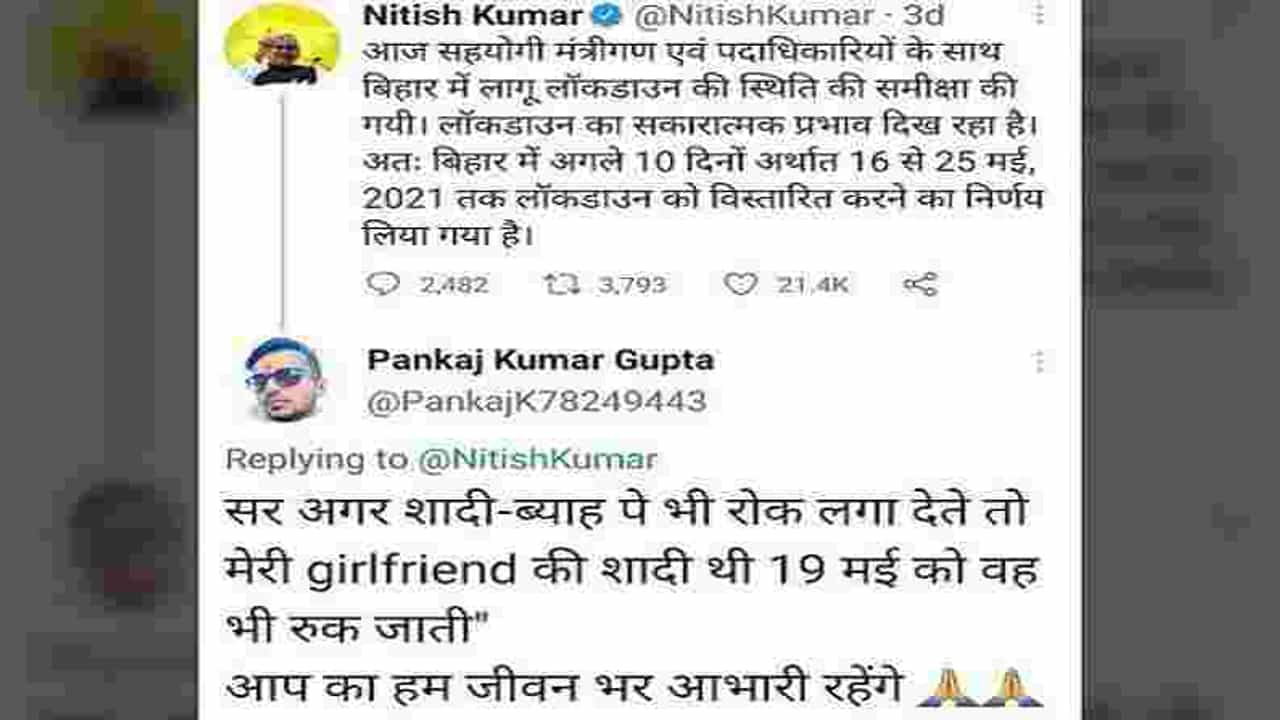 बिहारमध्ये 15 मेपर्यंत लॉकडाऊन होता. त्यानंतर 13 मे रोजी सरकारने आपत्ती व्यवस्थापन गटासोबत बैठक केल्यानंतर काही नियमांमध्ये बदल केला. नितीशकुमार सरकारने लॉकडाऊन 25 मेपर्यंत वाढवले. 13 मे रोजी मुख्यमंत्री नितीशकुमार यांनी स्वत:च याबाबत ट्विट केले. त्यावर पंकज कुमार गुप्ता नावाच्या तरुणाने कमेंट करून गर्लफ्रेण्डचे लग्न थांबवण्यासाठी लॉकडाऊन काळात लग्न सोहळ्यांवरही बंदी घालण्याची हटके विनंती केली. ‘सर, जर लग्न सोहळ्यांवरही बंदी घातली तर माझ्या गर्लफ्रेण्डचे 19 मे रोजी होणारे लग्न थांबेल. तुमचा मी आयुष्यभर ऋणी राहीन’ असे कमेंट करून पंकज कुमार गुप्ताने गर्लफ्रेण्डचे लग्न रोखण्यासाठी हटके स्टाईलचा प्रेमवेडा प्रयत्न केला. मुख्यमंत्री नितीश कुमार यांचे ट्विट वाचण्यासाठी ट्विटरला भेट देणाऱ्या नेटकऱ्यांनी पंकज कुमार गुप्ताच्या कमेंटला आवर्जुन एक लाईक दिला. एवढेच नव्हे तर त्याच्या कमेंटचा स्क्रिन शॉट सोशल मीडियात चांगलाच व्हायरल झाला आहे. लोक त्याच्या कमेंटवर वेगवेगळ्या प्रतिक्रिया नोंदवू लागले आहेत. प्रेम करावं तुझ्यासारखं, तुझ्यासारखी जिद्दी प्रेमवीर शोधून सापडायचा नाही, अशा वेगवेगळ्या प्रतिक्रिया नोंदवून नेटकऱ्यांनी प्रेमवेड्या पंकज कुमार गुप्ताला भरभरून दाद दिली आहे.