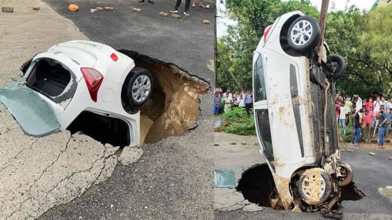 VIDEO : गुळगुळीत रस्त्यावर धावती कार थेट खड्ड्यात घुसली, जमीन खचल्याने रस्त्यावर भला मोठा खड्डा