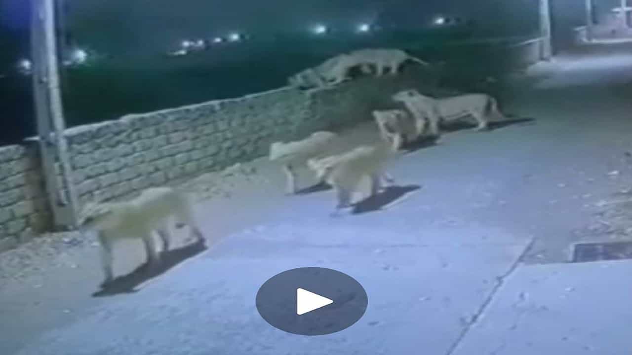 VIDEO | शिकारच्या शोधात 8 सिंह गावात घुसले, सीसीटीव्ही पाहा कसे ऐटीत चालतायत सिंह