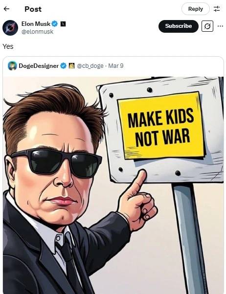 सध्या अब्जाधीश आणि टेस्लाचा मालक एलन मस्क भलताच चर्चेत आहे. त्याची एक पोस्ट रिपोस्ट झालीय. त्याने X वर एक फोटो रिपोस्ट केला आहे. त्यात त्याचं पेंट करण्यात आलेलं कॅरिकेचर दिसत आहे. या पेटिंगमध्ये मस्क काळा सूट आणि चष्म्यात दिसत असून बोर्डाच्या एका साईडला इशारा करत आहे. त्यावर लिहिलंय… MAKE KIDS, NOT WAR.