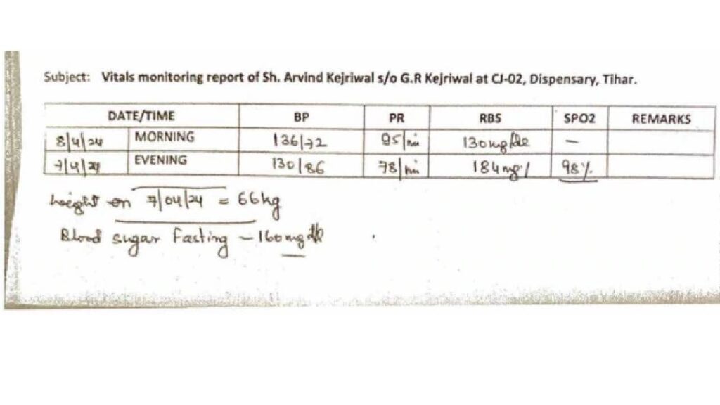 या राजकीय तिरंदाजीत तिहार तुरुंगाने अरविंद केजरीवाल यांच्या आरोग्याचे वार्तापत्र, हेल्थ बुलेटिनच जाहीर केले. त्यानुसार दिल्लीचे मुख्यमंत्री अरविंद केजरीवाल यांचे वजन एक किलोने वाढले आहे. पूर्वी त्यांचे वजन 65 किलो होते तर आता ते वाढून 66 किलो इतके झाले आहे. अर्थात हेल्थ बुलेटिननुसार, त्यांची शुगर लेव्हल, रक्तातील शर्करा वाढल्याचे समोर येत आहे. केजरीवाल यांची फास्टिंग शुगर लेव्हल 160 इतकी आहे. 1 एप्रिल रोजी केजरीवाल यांना तुरुंगात आणण्यात आले. त्यावेळी त्यांची रक्तातील शर्करा 139 इतकी होती. 2 एप्रिल रोजी शुगर लेव्हल 182 पर्यंत पोहचली. नंतर ती 140 वर आली. आता त्यांच्या रक्तातील शर्करेचे प्रमाण वाढल्याचे दिसून येते.
