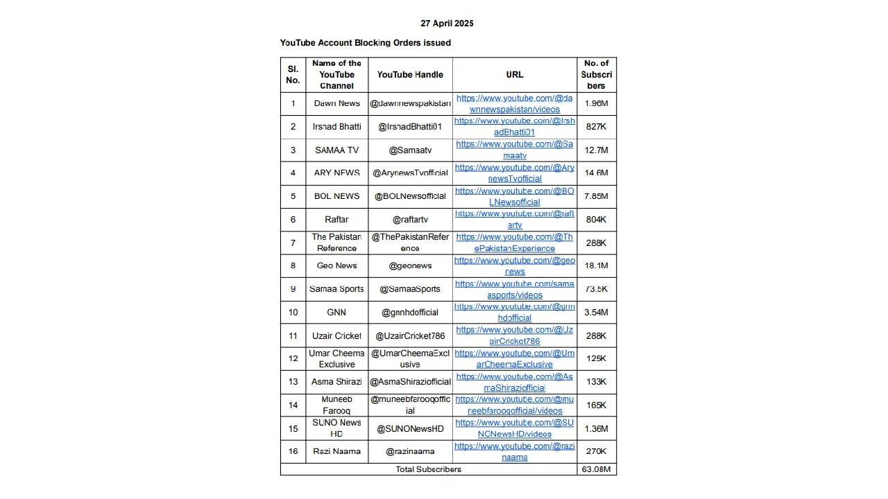 पाकिस्तानातील ज्या 16 युट्यूब चॅनल्सवर बंदी घालण्यात आली आहे, त्यात शोएब अख्तरचं चॅनल तसंच तिथल्या अनेक प्रमुख मीडिया हाऊसेसचे युट्यूब चॅनल्स यांचा समावेश आहे. डॉन न्यूज, समा टीव्ही, एआरवाय न्यूज, बोल न्यूज, रफ्तार टीव्ही, द पाकिस्तान रेफरन्स, जिओ न्यूज, समा स्पोर्ट्स आणि उजैर क्रिकेट हे त्यात प्रमुख आहेत.