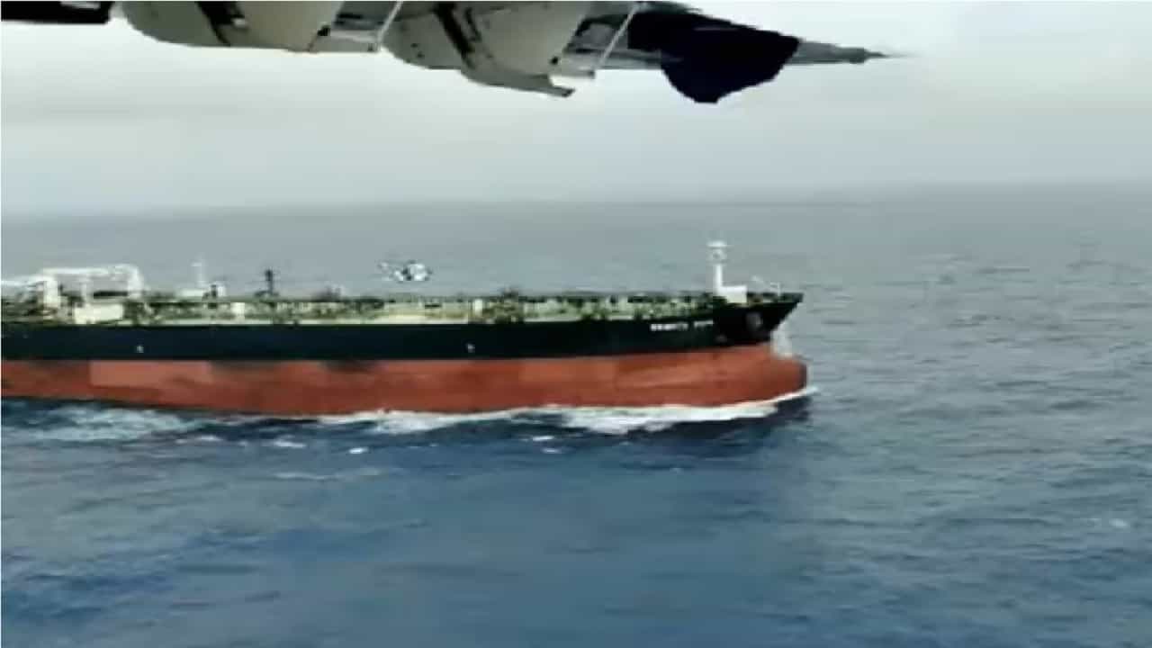 #WATCH | Indian Coast Guard ALH Dhruv chopper rescuing distressed merchant vessel crew from the Arabian Sea near the sinking vessel MT Global King I in Arabian Sea 93 nautical miles off the Gujarat coast: ICG officials