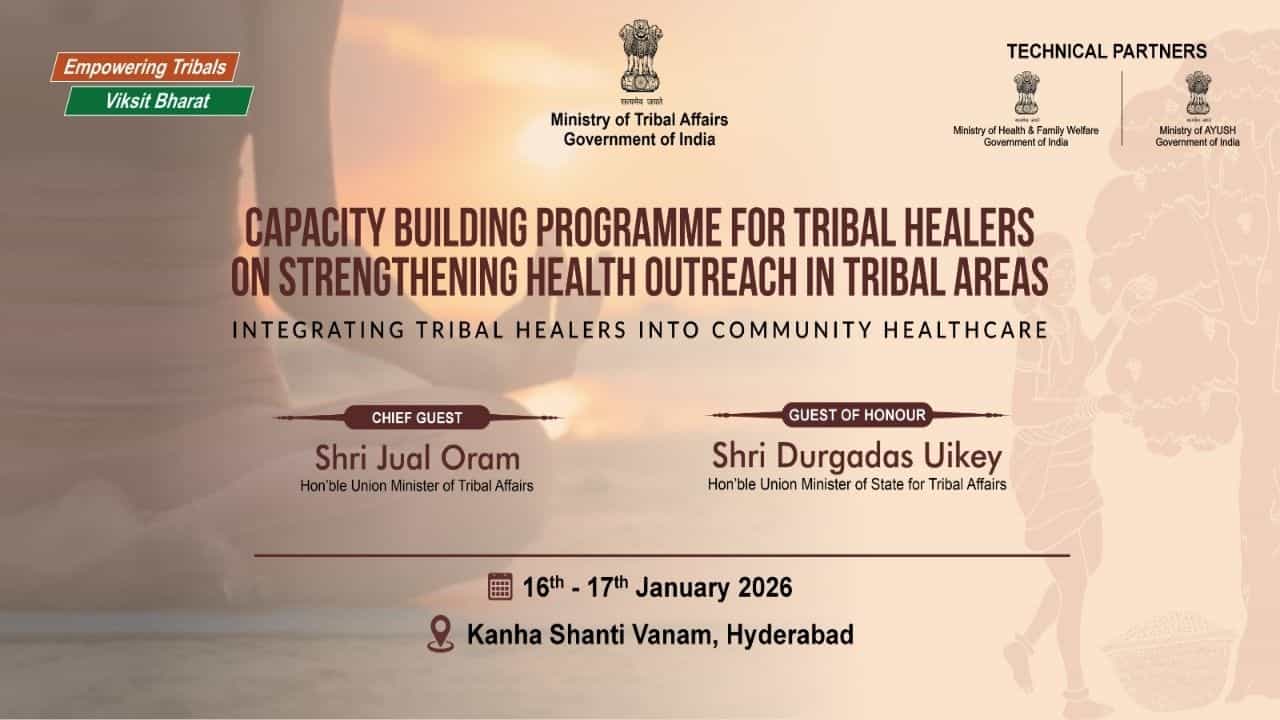 16-17 जानेवारी 2026, कान्हा शांती वनम, हैदराबाद, तेलंगणा : आदिवासी समुदायांच्या सर्वसमावेशक, न्याय्य आणि सांस्कृतिकदृष्ट्या रुजलेल्या विकासासाठी माननीय पंतप्रधानांच्या दृष्टिकोनाला पुढे नेत, भारत सरकारचे आदिवासी व्यवहार मंत्रालय (MoTA) 16-17 जानेवारी 2026 रोजी हैदराबाद, तेलंगणा येथे आदिवासी भागांमध्ये आरोग्य सेवांचा विस्तार बळकट करण्यासाठी आदिवासी वैद्यांसाठी भारताचा पहिला राष्ट्रीय क्षमता निर्माण कार्यक्रम आयोजित करणार आहे. हा कार्यक्रम भारतातील सार्वजनिक आरोग्य परिसंस्थेमध्ये आदिवासी आणि स्थानिक वैद्यांना विश्वासार्ह समुदाय-स्तरीय भागीदार म्हणून औपचारिकपणे मान्यता देण्यासाठी, सक्षम करण्यासाठी आणि समाकलित करण्यासाठी एक प्रकारचा पहिलाच राष्ट्रीय उपक्रम आहे.
