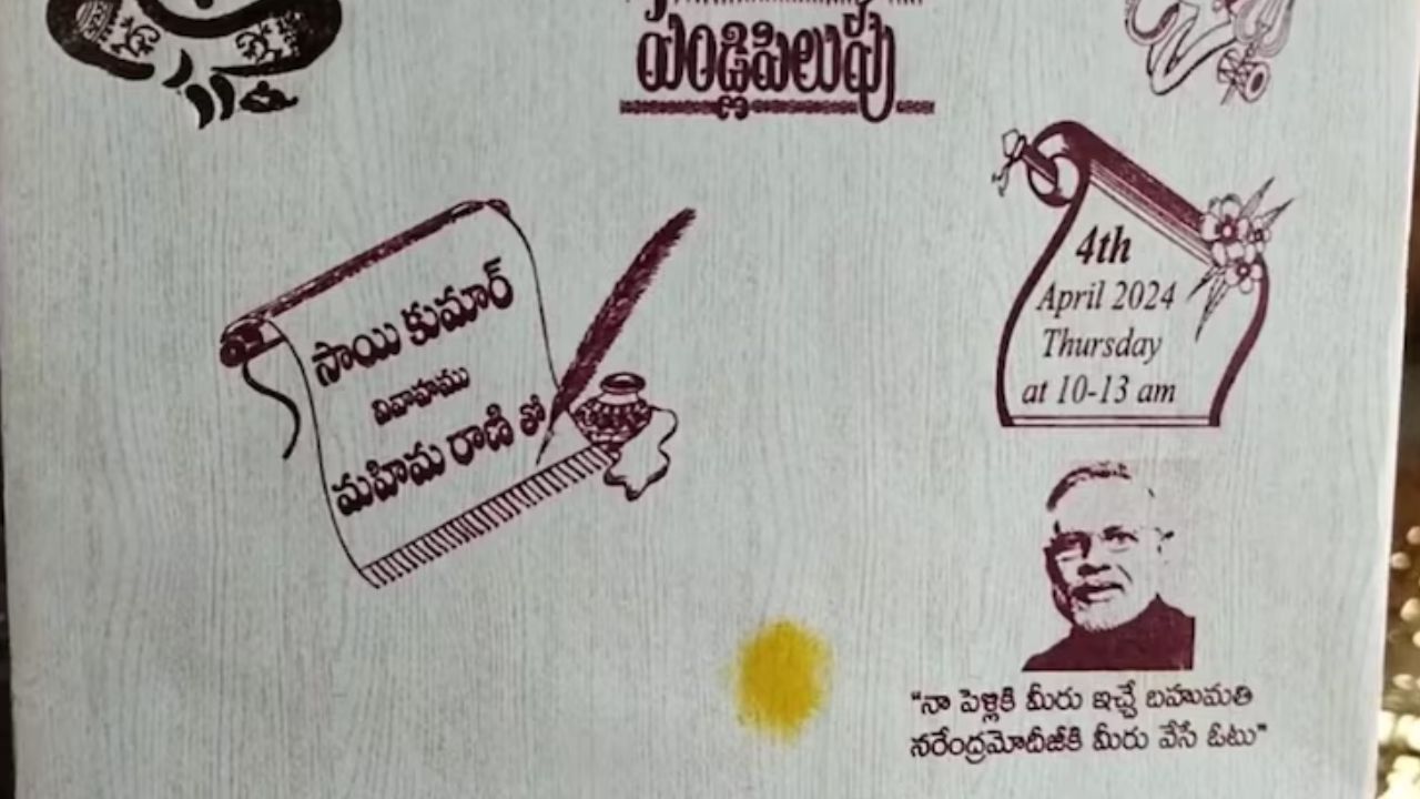 तेलंगणामधील संगारेड्डी जिल्ह्यातील लग्नपत्रिका सोशल मीडियावर चांगली व्हायरल होत आहे. नंदिकंती नरसिमलू आणि त्यांची पत्नी नंदिकंती निर्मला यांचा मुलगा साई कुमार यांचे 4 एप्रिल रोजी लग्न आहे. साई कुमारचे लग्न महिमा रानी हिच्याशी होत आहे. लाकडपासून तयार झालेल्या वस्तूंचा व्यवसाय करणारे नरसिमलू यांनी अनोखी लग्नपत्रिका तयार केली आहे. त्या लग्नपत्रिकेत पंतप्रधान नरेंद्र मोदी यांचा फोटो वापरण्यात आला आहे. त्यात म्हटले आहे की नरेंद्र मोदी यांना मतदान करणे हेच आमच्यासाठी महत्वाचे गिफ्ट आहे. नरसिमलू यांच्या दोन मुलींचे यापूर्वी लग्न झाले होते. त्यावेळी त्यांनी काही अपील केली नाही.
