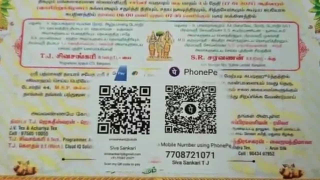 चेन्नई : कोरोनामुळे लोकांचं जीवन जगण्याची पद्धत पूर्णपणे बदलली आहे (Madurai Family Print QR Code On Wedding Invitation). या महामारीमुळे लग्न सोहळ्यातही मोठे बदल झाले आहेत. आता नवविवाहित जोडे लग्नसोहळ्यात पाहुण्यांकडून भेटवस्तू घेण्यासाठी वेगवेगळे मार्ग शोधत आहेत. सोशल डिस्टन्सिंगचे नियम पाळण्यासाठी आणि भेटवस्तू घेण्यासाठी आता ऑनलाईन मनी ट्रान्सफरचा आधार घेत आहेत. असाच एक अनोखा मार्ग तामिळनाडुच्या मदुरईमधील कुटुंबाने काढला आहे (Madurai Family Print QR Code On Wedding Invitation).
