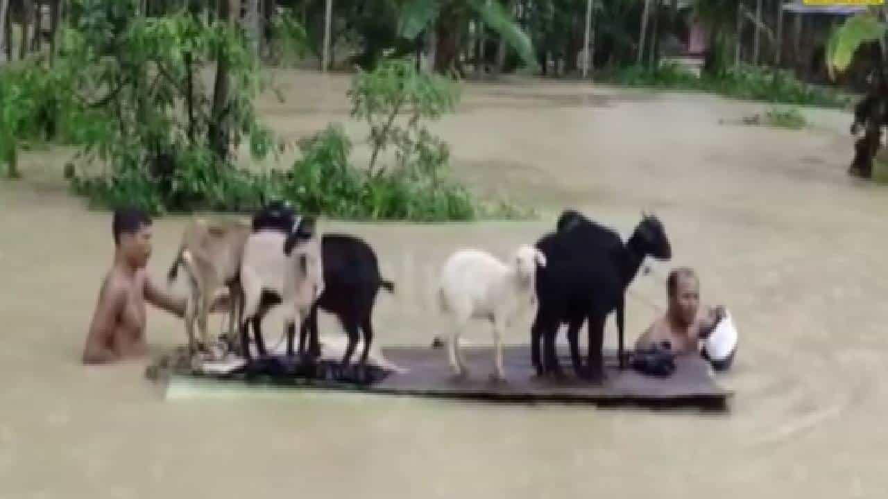 एकीकडे महापुरामुळे लोकांना वाचवण्यासाठी प्रशासनाकडून वेगवेगळ्या पातळीवरून मदत पुरवली जात आहे. आपत्तीच्या या काळात ही परिस्थिती सुरू असतानाच आसाममधील कांपूर, नागाव (Kampur, Nagaon) येथील एक व्हिडीओ व्हायरल झाला आहे. या व्हिडीओमध्ये दोन व्यक्ती आपल्या जनावरांना वाचवण्यासाठी पत्र्याच्या साहाय्याने त्याचा होडीसारखा वापर करून सहा बकऱ्यांना पुराच्या पाण्यातून सुरक्षित स्थळी घेऊन जाण्यात येत आहे.