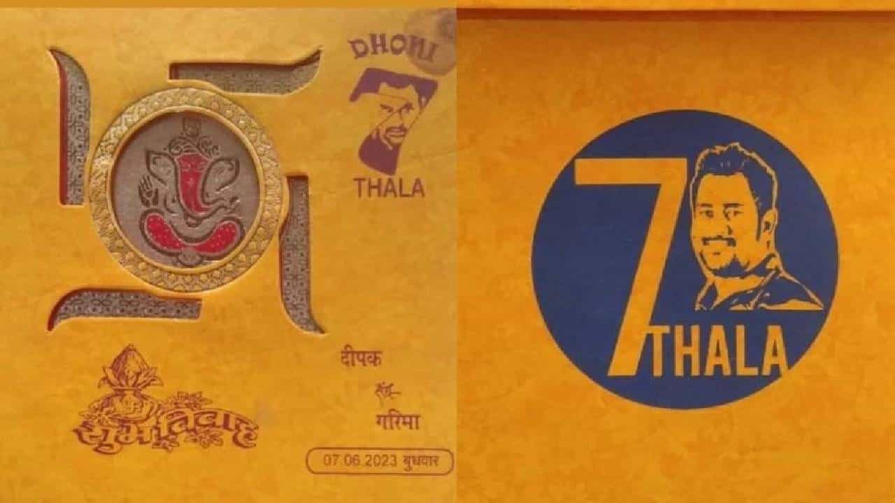 ही लग्नपत्रिका पिवळ्या रंगाची आहे. लग्नपत्रिकेवर एका बाजूला गणपतीचा फोटो आहे. स्वास्तिक चिन्हात गणपतीचा फोटो आहे. त्याच्या बाजूला सात नंबरचा आकडा दाखवला असून त्या आकड्यामध्ये धोनीचा फोटो आहे. त्यावर धोनी आणि खाली थाला असं लिहिलं आहे. त्यानंतर खाली दीपक आणि गरिमा असं लिहिलं आहे. नंतर शुभ विवाह असं लिहून लग्नाची तारीख बुधवार 7 जूनलिहिली आहे.