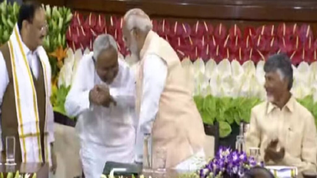 दिल्लीत आज राष्ट्रीय लोकशाही आघाडीसाठी महत्वाचा दिवस होता. नरेंद्र मोदी यांची एनडीच्या नेतेपदी निवड करण्यात आली. त्यावेळी एनडीएतील घटक पक्षातील नेत्यांनी त्याला अनुमोदन दिले. त्यावेळी अनेकांना त्यांच्या भावना व्यक्त केल्या. त्यांनी मोदींवर शब्द सुमनं उधळली. यावेळी बिहारचे मुख्यमंत्री आणि जनता दलाचे (संयुक्त) अध्यक्ष नितीश कुमार यांनी आशिर्वादासाठी नरेंद्र मोदींचे पाय धरले. तर मोदी संविधानासमोर नतमस्तक झाले. या दोन घटनांची देशभर चर्चा झाली.