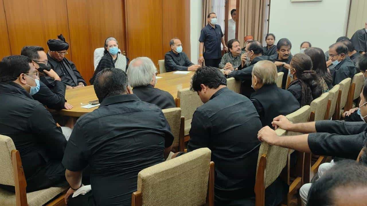 त्यापूर्वी विरोधी पक्षांची बैठक झाली. मल्लिकार्जुन खरगे यांच्या अध्यक्षतेखाली झालेल्या या बैठकीला काँग्रेस, डीएमके, समाजवादी पार्टी, जेडीयू, बीआरएस, सीपीएम, आरजेडी, एनसीपी, सीपीआय, टीएमसी, आययूएमएल, केसी, एमडीएमके, आरएसपी, आप, जम्मू काश्मीर एनसी, शिवसेना ( उद्धव ठाकरे गट) आदी पक्षाचे खासदार उपस्थित होते. मल्लिकार्जुन खरगे यांच्या दालनात ही बैठक झाली. या बैठकीला सोनिया गांधीही उपस्थित होत्या. या बैठकीला आलेले अनेक नेते काळे कपडे घालून आले होते. विशेष म्हणजे आम आदमी पार्टी आणि टीमएसीचे खासदार या बैठकीला उपस्थित राहिल्याने काँग्रेससाठी ही समाधानाची बाब असल्याचं सांगितलं जात आहे.