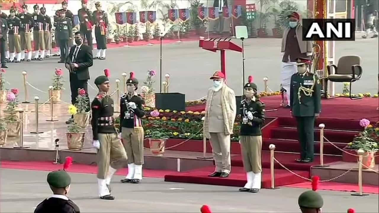 Delhi: Prime Minister Narendra Modi being accorded Guard of Honour at the rally of National Cadet Corps (NCC) at Cariappa Ground. pic.twitter.com/Vnad9N2UAf