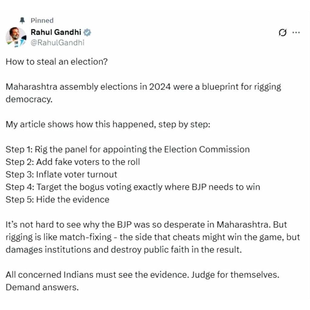 राहुल गांधी यांनी या लेखात भाजपवर मोठा घणाघात घातला. भाजपच्या नेतृत्वाखालील राष्ट्रीय लोकशाही आघाडीने महाराष्ट्राच्या विधानसभा निवडणुकीत मोठी हेराफेरी केल्याचा आरोप केला. पाच स्तरावर हा प्रकार केल्याचा आरोप राहुल गांधी यांनी आरोप केला.