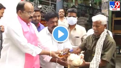 #WATCH | TRS leader Rajanala Srihari distributes liquor bottles and chicken to locals ahead of Telangana CM KC Rao launching a national party tomorrow, in Warangal pic.twitter.com/4tfUsPgfNU
