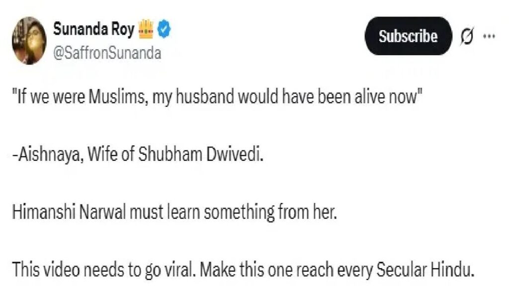 जम्मू-काश्मीरच्या पहलगाम येथे झालेल्या दहशतवादी हल्ल्यात 26 नागरिकांचा मृत्यू झाला. यात एक शुभम द्विवेदी होते. दहशतवाद्यांनी शुभम यांची पत्नीसमोर गोळ्या घालून हत्या केली. सर्वसामान्य जनतेसह नेते मंडळी पाकिस्तान विरोधात कठोर कारवाई करण्याची मागणी करत आहेत. शुभम यांच्या पत्नी म्हणाल्या की, ‘माझा नवरा मुस्लिम असता, तर तो आज जिवंत असता’ एका चॅनलला दिलेल्या त्यांच्या इंटरव्यूची क्लिप सोशल मीडियावर व्हायरल झाली आहे. या क्लिपवरुन लोक नौदल अधिकारी लेफ्टनंट विनय नरवाल यांची पत्नी हिमांशी नरवालला ऐशान्याकडून शिकण्याचा सल्ला देत आहेत.