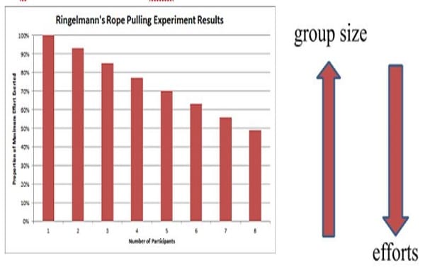 या आलेखावरुन आपल्या लक्षात येईल की खेळात जसे जसे लोकं वाढत गेले तसं त्या दोन लोकांची खेळातील कामगिरी घटत गेली. यालाच “social loafing” असं म्हणतात. याचाच अर्थ असा की, “जेव्हा लोकं एकत्र काम करतात तेव्हा त्यांची वैयक्तिक कामगिरी कमी होते.