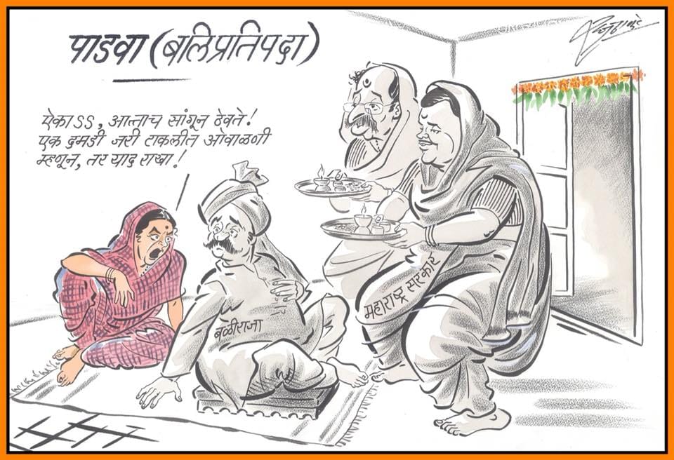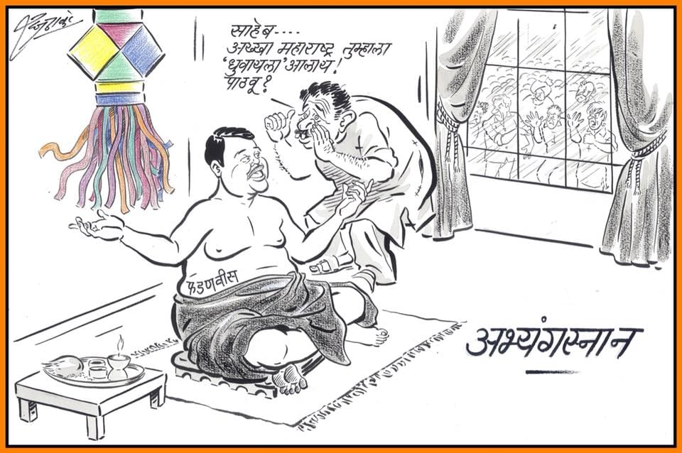 व्यंगचित्रातील पहिल्या चित्रानेच महाराष्ट्रात हास्यकल्लोळ निर्माण केला. राज यांनी दिवाळीच्या सुरुवातीला महाराष्ट्राच्या मुख्यमंत्र्याचं अभ्यंगस्नान व्यंगचित्राच्या माध्यामातून दाखवलं. मुख्यमंत्र्यांचे सुरक्षा रक्षक उघड्याबंब फडणवीसांना कानात विचारतो की महाराष्ट्र तुम्हाला धुवायला आलाय? आत पाठवू का?