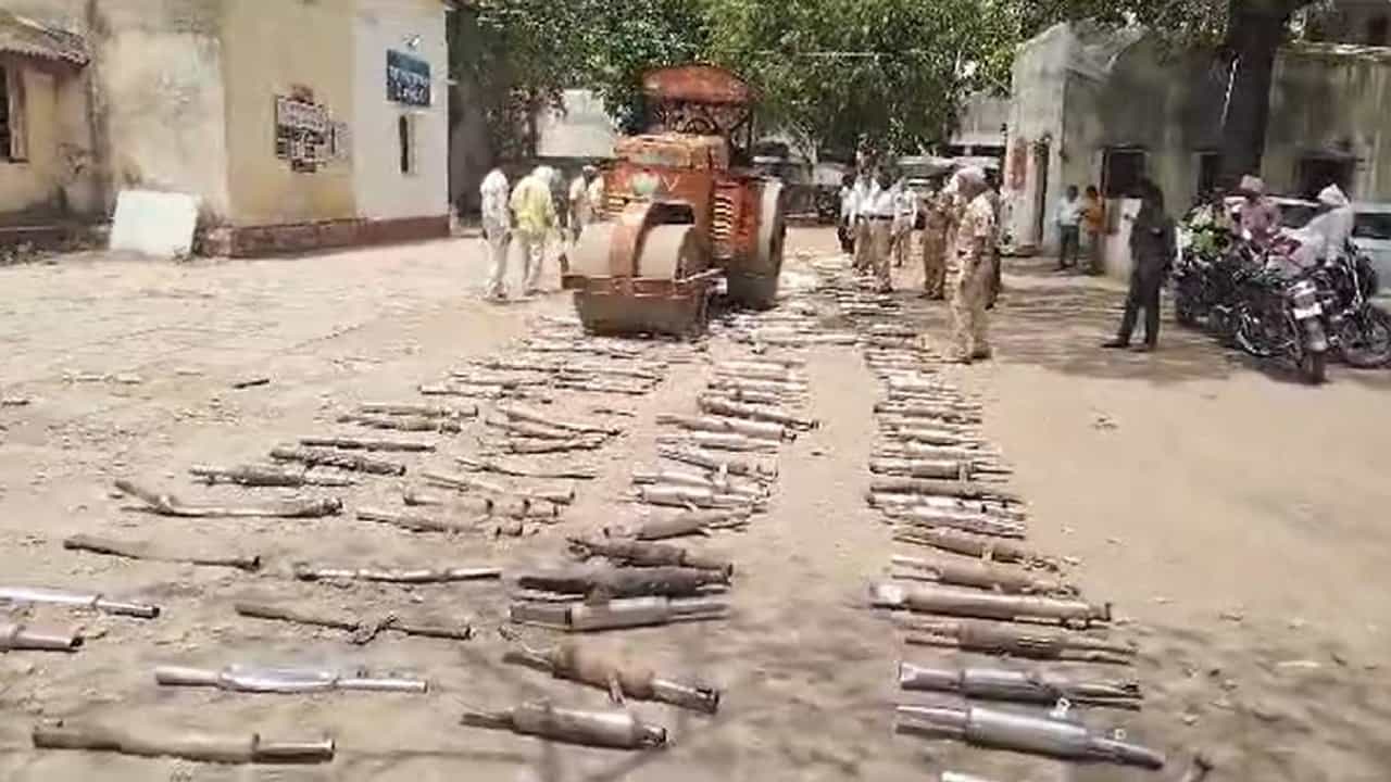 जप्त करण्यात आलेले सायलेन्सर रोडरोलरच्या साह्याने नष्ट करण्यात आले आहेत.