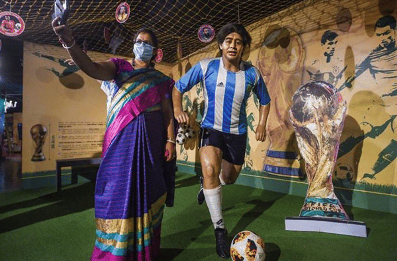 या प्रत्येक पुतळ्याच्या माध्यमातून काही तरी संदेश देण्याचा प्रयत्न कारागिरांकडून करण्यात आला आहे. प्रसिद्ध फुटबॉलर मॅरोडोनाच्या पुतळ्यासोबत एक महिला सेल्फी घेताना दिसत आहे.
