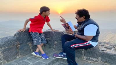 हा फोटो काही साधा नाहीये. सिंहगडावर बसून प्रवीण तरडे मुलाला ‘श्रीमान योगी’ ही कादंबरी ऐकवत आहेत.