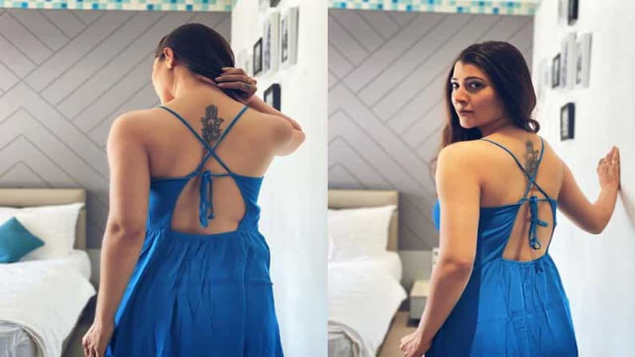 या फोटोंमध्ये तेजस्विनीने ब्लू बॅकलेस गाऊन घातला असून, पाठीवरील खास टॅटू फ्लाँट करताना दिसते आहे.