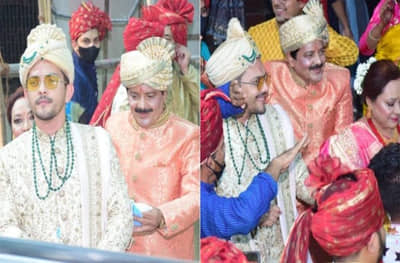 या विवाह सोहळ्यासाठी आदित्यने खास ऑफ-व्हाइट शेरवानी परिधान केली आहे. तर, हिरव्या रंगाची माळही घातली होती. आदित्यचे सनग्लासेस त्याच्या लूकमध्ये भर घालत आहे.