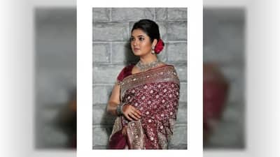 कथ्या रंगाच्या या साडीवर खास काम केलं आहे. या भरीव साडीसोबत प्राजक्तानं ऑक्सिडाईज ज्वेलरी कॅरी केली आहे, सोबतच तिनं केसात गुलाबाचं फुलही लावलं आहे.