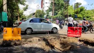 नाशिक शहरात सध्या गॅस लाईन टाकण्याचे काम सुरू आहे. याच गॅस लाईनसाठी शहरातील रस्ते मध्यभागीच फोडून ठेवलेत. पाऊस सुरू असताना रस्त्यावरील हे सर्व खड्डे पाण्याने भरतात. याच खड्ड्यात वाहनंसुद्धा फसतात. मध्यभागी रस्ता खोदल्यामुळे नागरिकांना हा फटका बसत आहे. वाहतूक कोंडीबरोबरच वाहन या खड्ड्यांमध्ये फसत असल्यामुळे नागरिक त्रस्त आहेत.