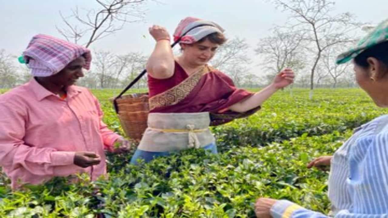 प्रियांका गांधी चहाच्या मळ्यात पाने खुडताना.