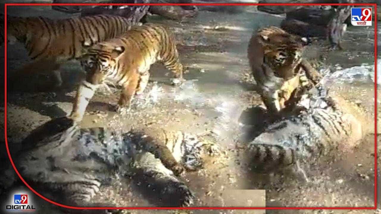 विविध प्राणी संग्रहालयांमध्ये उन्हापासून संरक्षण मिळण्यासाठी प्राण्यांची वेगवेगळ्या पद्धतीने काळजी घेतली जाते. औरंगाबादमध्ये मात्र अगदी साध्या पद्धतीने वाघांना थेट थंड पाण्याच्या पाइपने अंघोळ घातली जात असून हे वाघोबा त्याचाही मनसोक्त आनंद लुटत आहेत.