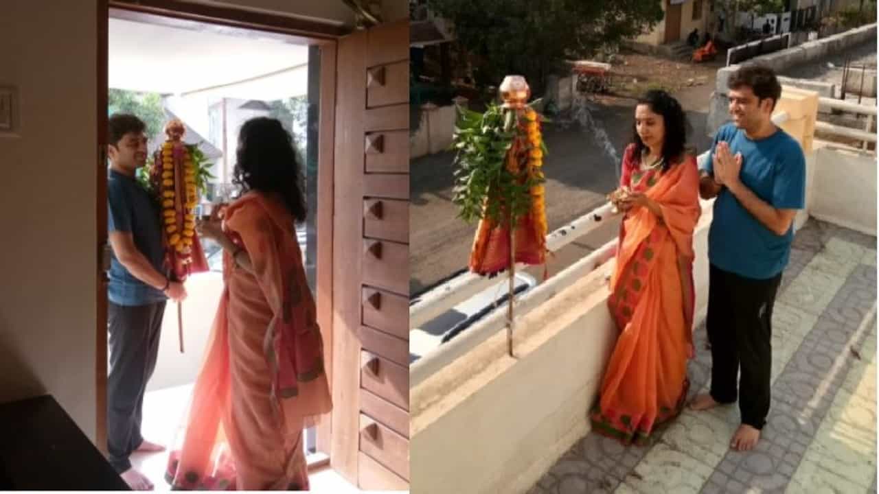 पारंपरिक पद्धतीने गुढीचे पूजन करुन हर्षवर्धन जाधव आणि ईशा झा यांनी गुढी उभारली.