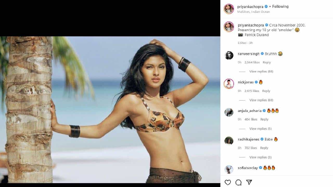 हा फोटो शेअर करत प्रियांकाने Circa November 2000. Presenting my 18 yr old “smolder” ?: Patrick Durand असं कॅप्शन दिलं आहे. प्रियंका चोप्राने बिकिनी, बिंदी, बांगड्यांमधील फोटो शेअर केला; निक जोनास, रणवीर सिंग यांनी फोटोवर कमेंट केली आहे.